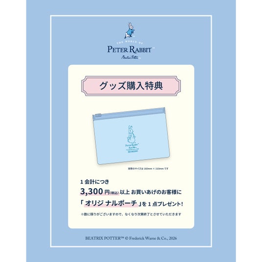 お買い上げ特典:税込1,500円以上お買い上げのお客様にステッカーを1枚、税込3,300円以上お買い上げのお客様にクリアポーチを1枚をプレゼント!