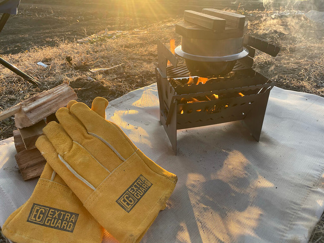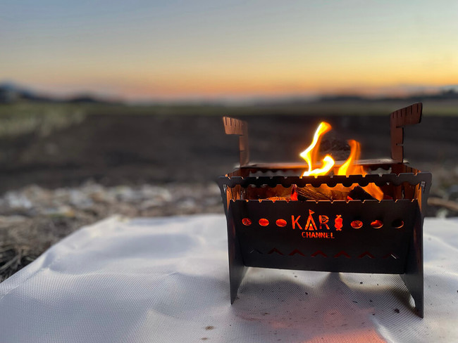 「五徳」と「鉄板」が付属し、アレンジ次第でさまざまなキャンプ飯を楽しめます。鉄板はメスティンやお釜、パネルの差し込み位置を変えることで簡単に火力調整ができるので、焼くものによって火加減を調整できます。「狩」をコンセプトとし、無骨さのあるデザインに仕上げました。火を入れると、Nozomi氏がデザインした「KARI」の文字がきれいに浮き上がります。