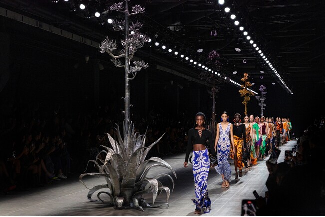 キャットウォークには大きなアガベのオブジェが並び、地中海の雰囲気を感じさせます。このコレクションは、色の鮮やかさを通じて南の土地を表現していますが、特定の場所や文化に縛られることはありません。これはマルコ・デ・ヴィンチェンツォの視点で、直感とひらめきを大切にしながら、新しいものを生み出していく旅なのです。それは、クリエイティブ・ディレクターとエトロのデザインコードが絶えず対話することで生まれる、自由で無限の可能性を秘めた旅です。