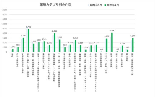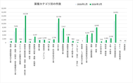 2026年2月の業種別入札件数では、多くのカテゴリで前月から増加が見られました。