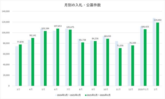 2026年2月の入札・公募件数は119,002件でした。前月(2026年1月:106,425件)から12,577件の増加(前月比111.8%)となり、1月に続いて増加しています。年初以降、件数は高水準で推移しています。