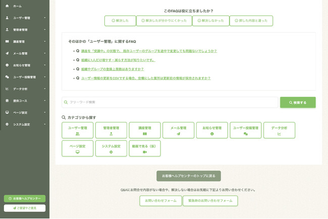 そんな10周年記念企画の一環として今回、「お客様ヘルプセンター」を公開しました。「お客様ヘルプセンター」とは、LearnOの管理画面に関する疑問や悩みを管理者ユーザー自身で解決できるように公開されたQ&A形式のWebマニュアルになります。