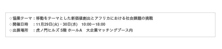 人と技術と地球が調和した持続可能な未来の実現を目指すホンダトレーディングでは、「移動」をテーマにモビリティとデジタルテクノロジーを組み合わせた新しい価値創出を検討しており、早期実現のための協業パートナーを募集しています。さらに、アフリカでのモビリティを活用した新事業などを開発しており、アフリカにおける様々な社会課題に対して共に挑戦するパートナーを募集しています。