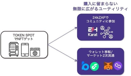 全国各地に配置されている株式会社アドインテの最大1,000台のサイネージ型自動販売機「AIICO」にて人気NFTプロジェクトが限定デジタルグッズの販売を開始致しました。ブラウザ完結、クレジットカード決済に対応しており、いずれも1,000円台とお求めやすい価格になっています。また、連携ウォレットアプリである24karat株式会社の24kZAP上では各IPを知るための限定体験コンテンツをTOKEN SPOTコミュニティにてご用意。ご購入前後に、IPのストーリーやMVをお楽しみください。
