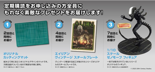 定期購読をお申込みの方にもれなく、カッティングマット、ヴィンテージスチールプレート、1/10スケール ゼノモーフ フィギュアをプレゼントさせて頂きます。