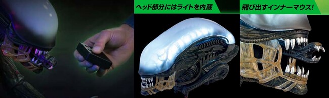特徴的なフォルムのヘッドの内部にはライトを内蔵し、人間の頭蓋骨を模した「インナースカル」のようすを確認できます。ヘッド部にはサウンド・センサーが隠されており、劇中同様、静かに音のなる方向へと顔を向けます。