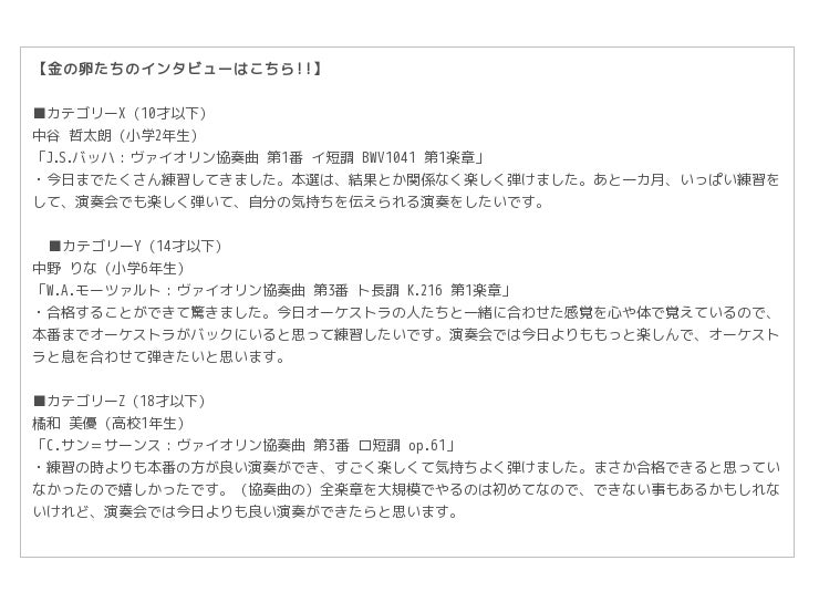 才能あふれる「金の卵=未来の音楽家」と一流オーケストラメンバーの共演にどうぞご期待ください。
