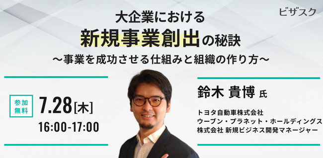 「知見と、挑戦をつなぐ」をミッションにグローバルなナレッジプラットフォームを運営する株式会社ビザスク(以下、当社)は、「大企業における新規事業創出」をテーマに、ウーブン・プラネット ・ホールディングス 新規ビジネス開発マネージャーである鈴木 貴博氏のご登壇による無料オンラインセミナーを、7/28(木)16時より開催します。