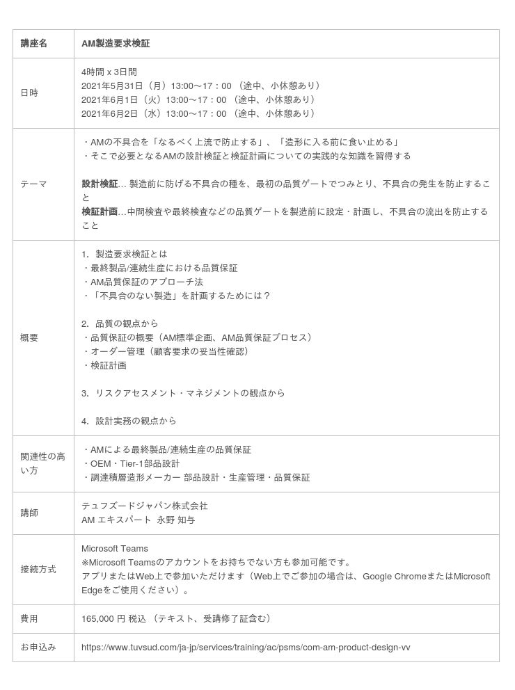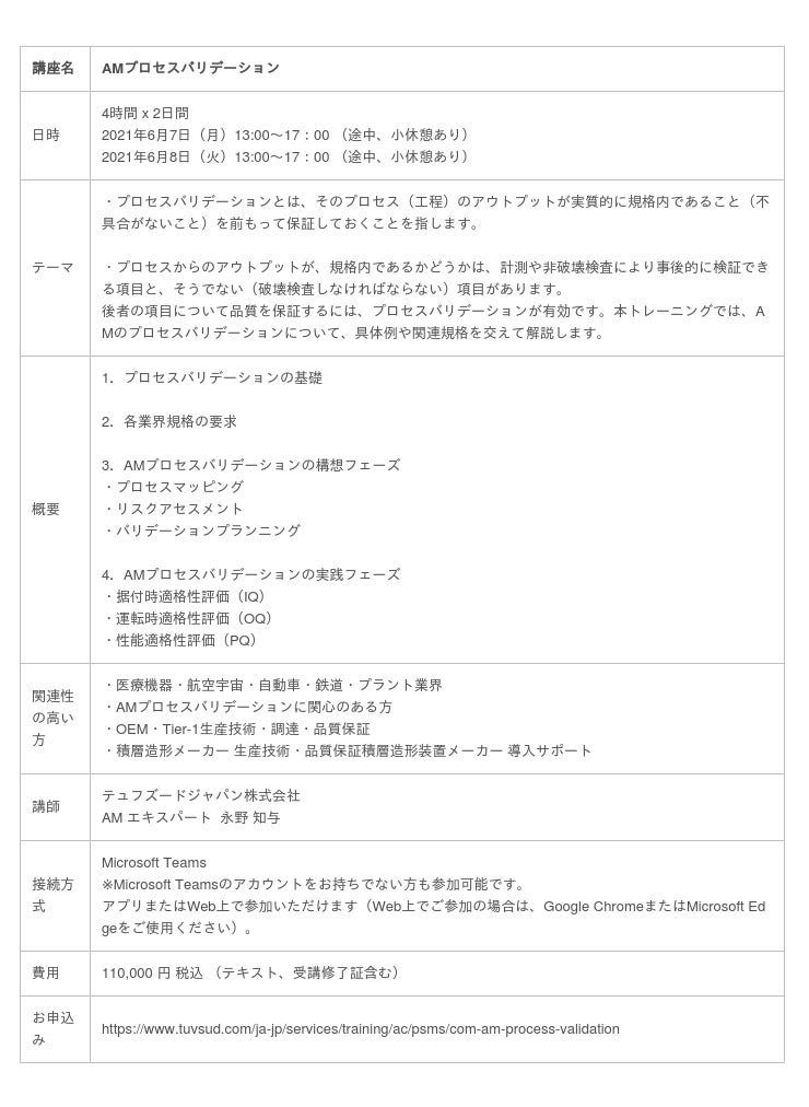 テュフズードジャパンは、最終製品/連続生産へのAM(アディティブマニュファクチャリング、3Dプリンティング、積層造形)適用に向けた人材育成や能力管理にご活用いただけるトレーニングプログラムを提供しています。今回開催するのは、AMの不具合の発生と流出の防止のための「AM製造要求検証」と、破壊検査でしか確認できない不具合をどのように品質保証するかを取り扱う「AMプロセスバリデーション」の2講座です。