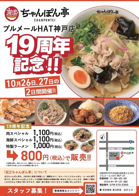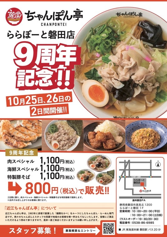 ドリームフーズ株式会社(本社:滋賀県彦根市、代表取締役:山本英柱)は、地域に愛され続ける「近江ちゃんぽん亭」について、ららぽーと磐田店が9周年、ブルメールHAT神戸店が19周年を迎えることをお知らせいたします。長年にわたりご愛顧いただいているお客様への感謝を込め、各店舗で2日間限定の特別感謝イベントを開催いたします。