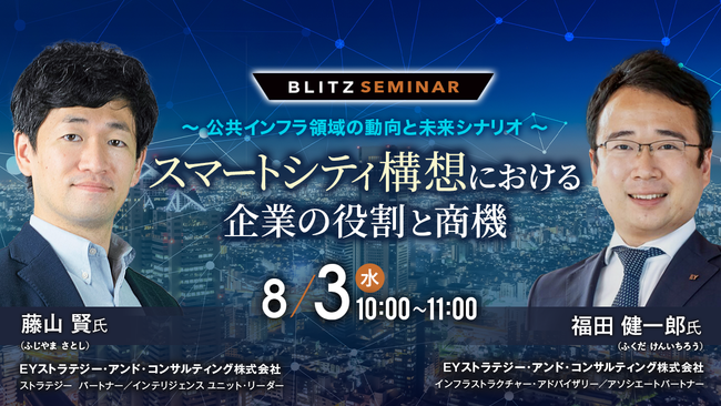 TECHBLITZ主催のオンラインセミナーシリーズ「BLITZ SEMINAR」。今回はEYストラテジー・アンド・コンサルティング株式会社の藤山賢 氏および福田健一郎 氏をお招きし、公共インフラ領域におけるスマートシティ構想×公民連携についてお話しいただきます。