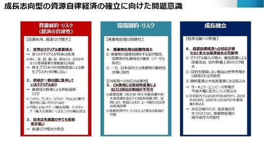 サーキュラーエコノミーへの移行は、経済的目標(経済成長)と社会的目標(経済安全保障、サステナビリティ、Well-Being(人間の幸福))を同時に実現する「新しい成長」に繋がるものとして政府が注力しています。