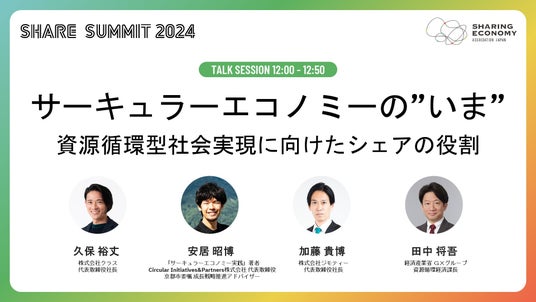 一般社団法人シェアリングエコノミー協会(代表理事:上田祐司、石山アンジュ)は、2024年11月5日(火)に開催する、シェアリングエコノミーがもたらす新たな地域経済圏の祭典「SHARE SUMMIT 2024」( https://sharing-economy.jp/ja/sharesummit/ss2024 )のセッション「サーキュラーエコノミーの"いま"」に経済産業省 GXグループ 資源循環経済課 課長 田中 将吾氏が登壇することをお知らせします。