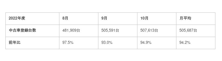 【中古車市場統計レポート(2022年10月)】より抜粋してご案内いたします。本調査詳細はこちら:https://www.kurumaerabi.co.jp/useful-details/2466/