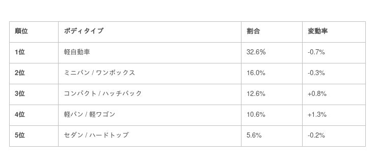 一際目を引くのは、軽バン/軽ワゴンが1.3ポイント増加して10%台に乗ったこと。