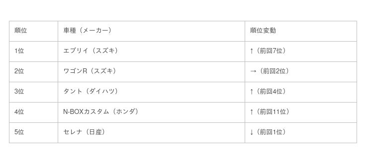 国産車の車種別ランキングでは、スズキのエブリイが1位となりました。その他は上位同士で順位を入れ替えたような形で、前回1位だった日産セレナが今回は5位という結果に。