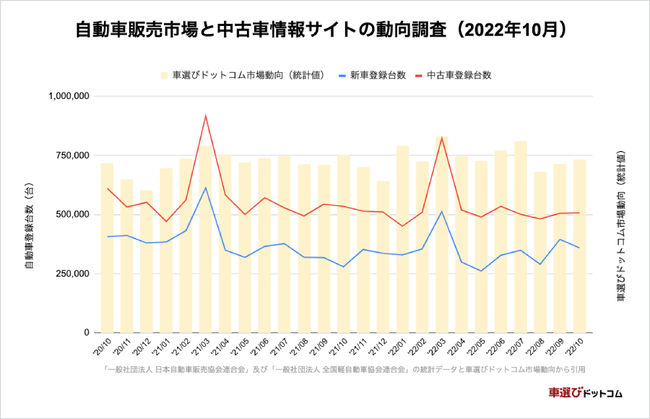 中古車情報サイト「車選びドットコム(https://www.kurumaerabi.com/)」を運営する株式会社ファブリカコミュニケーションズ(本社所在地:愛知県名古屋市中区、代表取締役社長:谷口 政人)より、2022年10月における自動車登録台数の推移と、中古車情報サイト「車選びドットコム」の販売台数推移から、中古車市場の動きをまとめたレポートをご案内いたします。