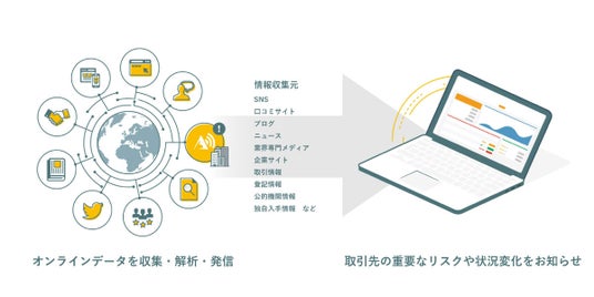 AI与信管理クラウドサービス「アラームボックス」( https://alarmbox.jp )は、企業や自治体のHPに掲載された情報や、SNSや口コミなどインターネット上で投稿された情報をAI技術で収集・解析し、提供するクラウドサービスです。新規取引時の与信判断、既存取引先の継続的な与信管理、さらに売掛保証までを一括して行うことができます。収集・判断の難しいネット上の情報を、与信への影響度を診断したうえで提供するため、インターネット上の情報を活用した高精度な与信管理を、簡単に、低価格で導入できます。それにより、取引先の情報収集に関わる業務負荷を大幅に削減し、スマートフォンやPCから取引先を登録しておくだけで、迅速にリスクに対応できます。