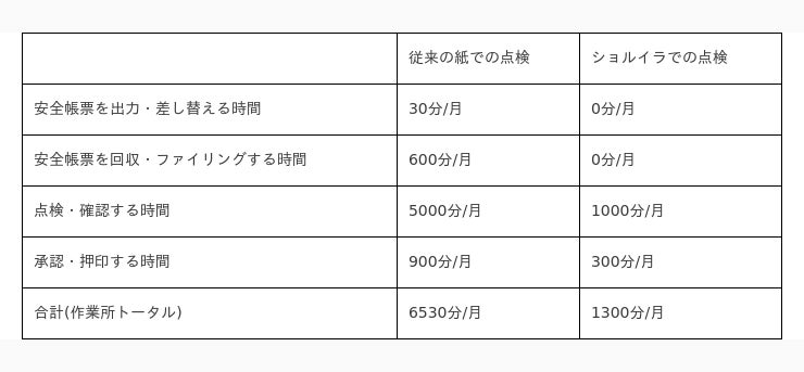 作業所における毎月の点検票の印刷、ファイリングおよび毎日の点検、押印にかかる時間を80%削減