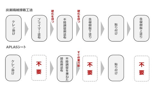 右:炭素繊維接着工法と「APLASシート工法」の施工工程の比較