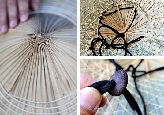 クバ笠の骨組みには布袋竹が使用されており、その強度と軽量感はまさに一級品です。さらに、内側には竹ヒゴの代わりに細い紐を使用し、全体が軽量化されているため、頭に負担をかけません。