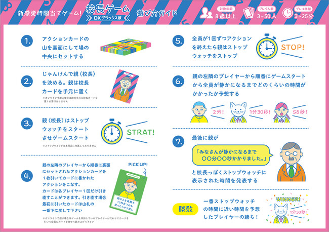株式会社MOGURA ENTERTAINMENT(本社:東京都新宿区、代表取締役:野村岳史)は、新感覚!時間当てカードゲーム『「校長ゲーム」みなさんが静かになるまで◯◯秒かかりました DXデラックス版』を発売致します。旧作はYoutubeでのプレイ動画の総再生回数が100万回を超えており多くの方に楽しんでいただける作品となりました。今作ではアクションカードを33枚増量し、幅広い内容のアクションカードを収録しています。
