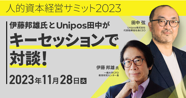 カルチャーを変え、人と組織の力を引き出すwebサービス「Unipos」を提供するUnipos株式会社(本社:東京都渋谷区)は、2023年11月28日(火)開催「人的資本経営サミット2023 ~未来を切り拓くリーダーたちと最前線に迫る~」(主催:一般社団法人 人的資本経営推進協会)にプラチナ協賛企業として参画いたします。当日は、一橋大学CFO教育研究センター長であり「人材版伊藤レポート」などで日本の人的資本経営を牽引する伊藤邦雄氏と、当社代表・田中弦のセッションもございます。
