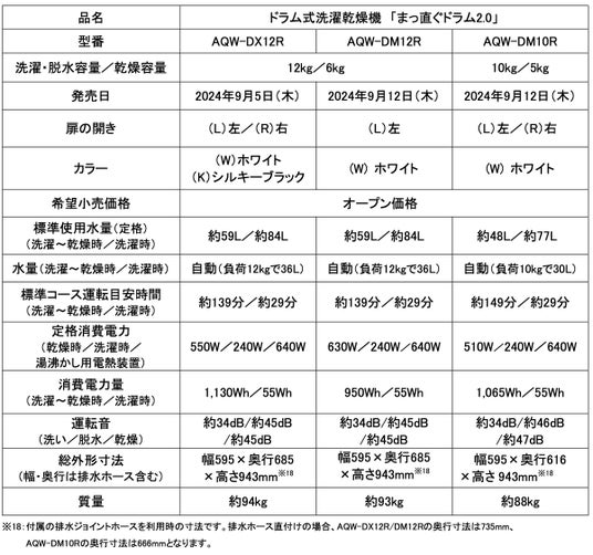 「まっ直ぐドラム2.0」は最上位モデルのAQW-DX12Rの他、ベーシックモデルのAQW-DM12R、洗濯容量10kg・奥行き616mmの薄型設計AQW-DM10Rの計3機種をラインナップ。ライフスタイルや設置場所に合わせて必要な容量・機能からお選びいただけます。