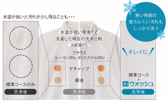 水温や水硬度、洗剤の種類、汚れの量、布質など10種類の洗濯状況をセンシング。その情報を元に、洗い時間や洗剤量などを自動で調整して洗濯します。水温が低い冬場の洗濯にもおすすめです。