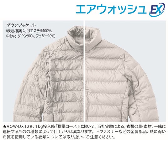 ※6:<エアウォッシュはっ水復元コースによるはっ水機能の復元>[試験機関](一財)ボーケン品質評価機構 [試験方法]はっ水機能が劣化したナイロン布をJIS L 1092、はっ水度試験(スプレー試験)の比較見本にて評価 [はっ水復元方法]「エアウォッシュはっ水復元コース」による [はっ水復元部分]ドラム内の衣類 [試験結果]初期1級、「エアウォッシュはっ水復元コース」4級 ●はっ水機能復元の効果は、衣類の種類によって異なります。 ●はっ水機能を新品の状態に戻すわけではありません。 ●生地の劣化によるはっ水劣化は復元できません。 ●防水加工(水を通さない加工)されたものには効果がありません。 *エアウォッシュは乾燥を目的としたコースではありません。衣類の状態によっては、エアウォッシュの効果が得られなかったり衣類を傷めたりするおそれがあります。