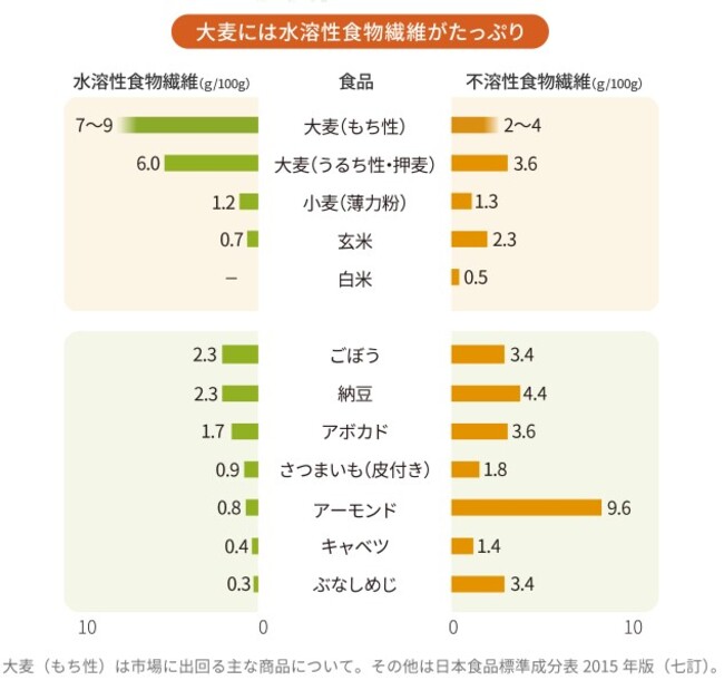 食物繊維には便のカサを増して腸の動きをよくする不溶性と、食後高血糖を防いだり、腸内細菌のエサとなって腸内環境を整えたりしてくれる水溶性の2種類があり、「もち麦」には不溶性と水溶性のWの食物繊維がバランス良く豊富に含まれています。