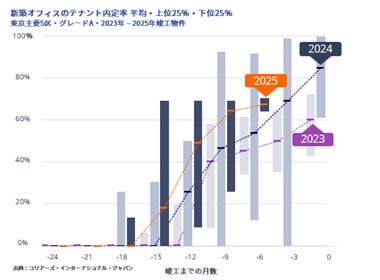 【新築オフィスのテナント内定状況】2025年の竣工前テナント内定状況は、経済回復や市場環境の改善などにより2024年よりも良い傾向にあります。