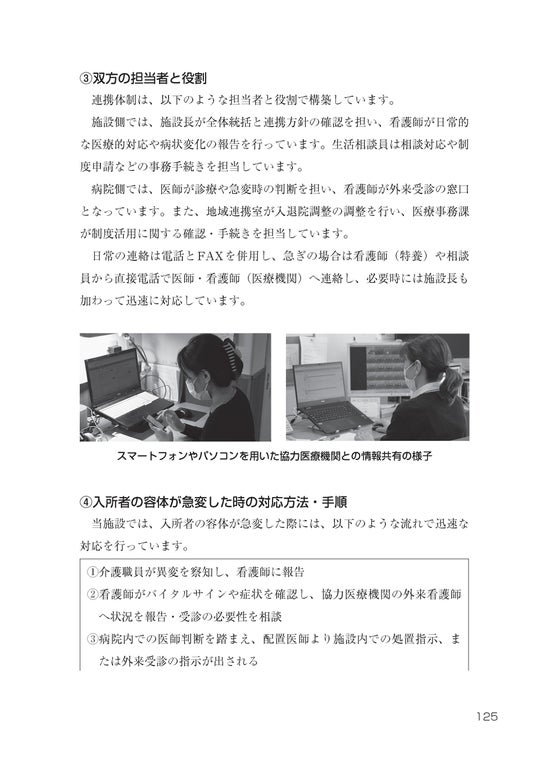 「施設内の対応フローの更新」「暮らしと医療の切れ目ない支援の実現」「ICTを活用した情報共有」など、実際に連携を強化し、稼働率の改善や職員の安心感向上につなげた全国の介護施設の事例を写真や資料と共に紹介しています。