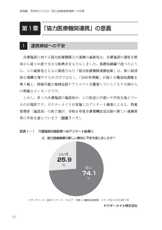 本書は、こうした「現場の切実な声」に応えるために執筆されました。単なる制度解説に留まらず、ドクターメイトが延べ600以上の介護施設支援で培った、「明日から使える交渉術」や「協定書テンプレート」、さらに「連携を成功させた施設事例」のノウハウを凝縮した、介護現場を支える実践的なガイドブックです。