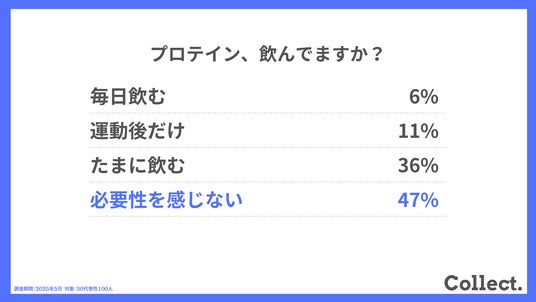 「たまに飲む(36%)」と「運動後だけ(11%)」を合わせると、5割近くの人がプロテインを摂取した経験があると回答しました。「毎日飲む(6%)」も含めて、プロテインの摂取経験がある人が半数を超えました。