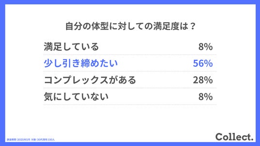 「少し引き締めたい(56%)」と答えた人が過半数を占め、多くの人が体型改善を望んでいることがうかがえる結果となりました。加齢による体型の変化が目に見えやすいため、現状維持よりも改善を目指す人が多いようです。