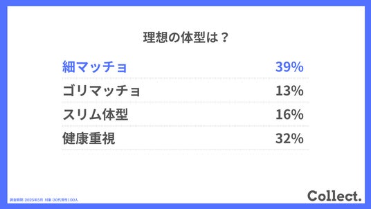 - 理想体型は「細マッチョ」が約4割。健康志向と見た目の両立を追求
