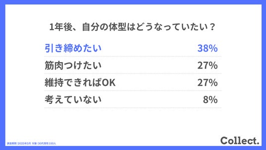 「引き締めたい(38%)」が最も多く、「筋肉をつけたい(27%)」「維持できればOK(27%)」が続きました。運動習慣の定着とともに、心身の健康維持への関心が高まっていることがうかがえます。