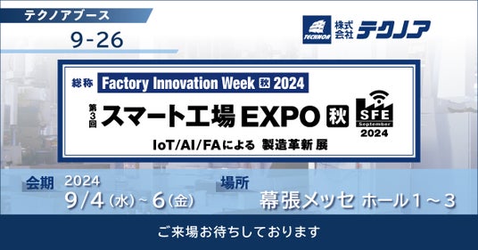 株式会社テクノア(本社:岐阜県岐阜市、代表取締役:山崎 耕治)は、9/4~6に 幕張メッセ で開催される「 Factory Innovation Week [秋] 2024 」に出展いたします。