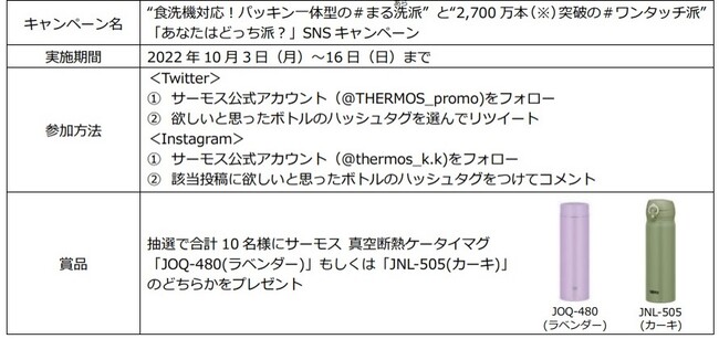 魔法びんのグローバル企業として、人と社会に快適で環境にもやさしいライフスタイルを提案するサーモス株式会社(本社:東京都港区 社長:片岡有二)は、『"食洗機対応!パッキン一体型の#まる洗(あら)派"と "2,700万本(※)突破の#ワンタッチ派"「あなたはどっち派?」SNSキャンペーン』を10月3日(月)~16日(日)までサーモス公式Twitter、および公式Instagramで実施します。(※)2012年8月~2022年6月末時点累計出荷本数