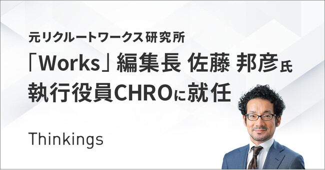採用管理システム「sonar ATS」(ソナーエーティーエス)を提供する Thinkings株式会社(シンキングス、本社:東京都中央区、代表取締役社長:吉田 崇)の執行役員CHROに、リクルートワークス研究所が発行する人事プロフェッショナルのための研究雑誌『Works』の前編集長であり、人事業務に広い知見を持つ佐藤邦彦氏が就任いたしました。当社の今後の成長を見据えた組織づくりはもとより、sonar ATS導入企業に対する提供価値の向上を目指します。