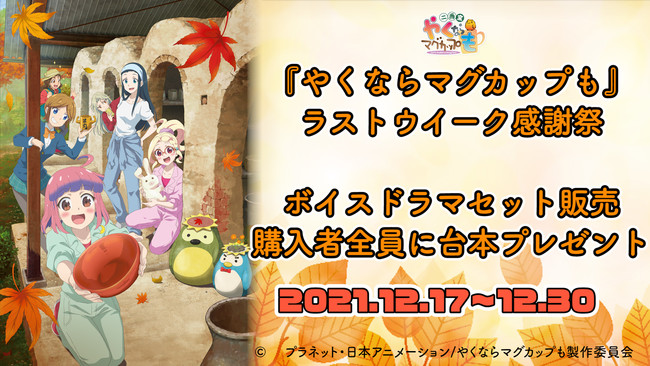 「クリエイティビティ×テクノロジー」の力でIP開発を行う株式会社CHET Group(本社:東京都品川区 代表取締役CEO:小池祐輔)と映像コンテンツ制作やWEBメディアの運営を通じて地域創生支援を行う株式会社Zipangが、現在放送中のTVアニメ『やくならマグカップも 二番窯』のまもなく迎える最終話をより盛り上げるために『ラストウイーク感謝祭』を2021年12月17日(金)~12月30日(木)の期間で実施!豪華なプレゼントが当たるTwitterキャンペーンも開催いたします。