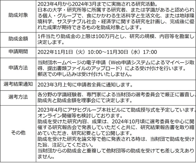 公益財団法人アサヒグループ学術振興財団(所在地 東京都墨田区、代表理事 加賀美 昇)は、11月1日(火)から11月30日(水)までの期間で、2023年度の学術研究の助成対象を募集します。