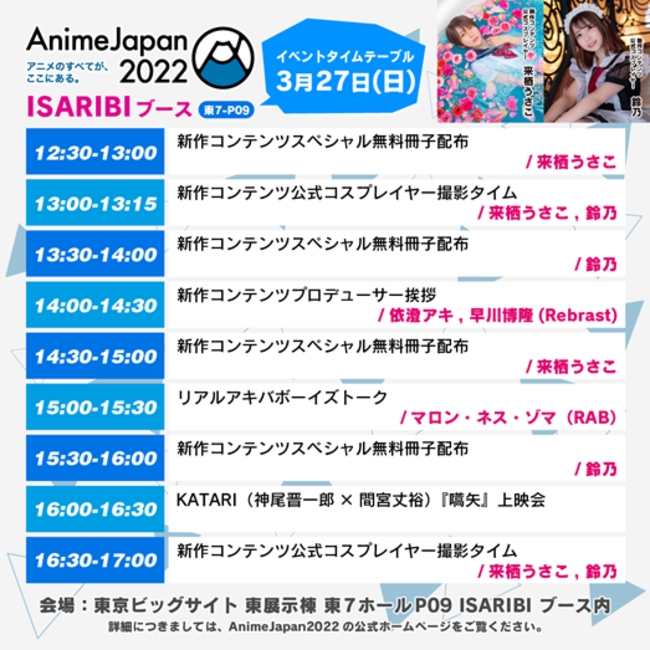 ISARIBI株式会社は、2022年3月26日(土)~2022年3月27日(日) 9:00~17:00(最終入場16:30)、東京ビッグサイト(〒135-0063 東京都江東区有明3-10-1) 東展示場 東1~8ホールにて開催される「Anime Japan 2022」(パブリックデイ)にブースを出展する。