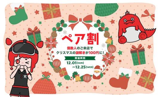 偶数人でご来場いただき、RED°/ナイトパスポートをご購入いただくと、クリスマス限定の謎解き(1人300円)を100円で楽しむことができます。“ペア割”を使ってお得にクリスマスの謎解きに参加しよう!