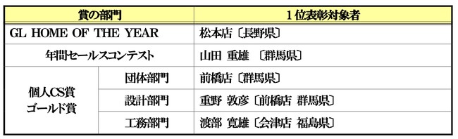 新築部門の最高賞である「GLHOME OF THE YEAR」グランプリには、GLホーム松本店が受賞しました。また、22年度は個人セールス賞、個人CS賞、団体CS賞、デザインコンテストなどを受賞した前橋店の活躍が目立ちました。なお、2022年度の各種コンテストの受賞者・受賞店は次頁の通りです。