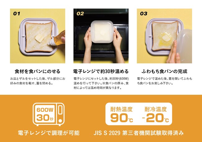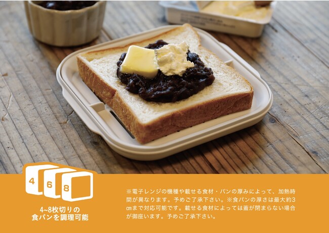 電子レンジで簡単に食パンの調理が可能な「ふわもち食パンクッカー」は食パンの上にお好みの食材を載せて電子レンジで約30秒温めるだけで、まるで出来立てのような「ふわっともちもち食感」の食パンをお楽しみ頂けます。