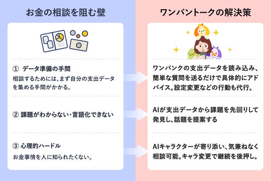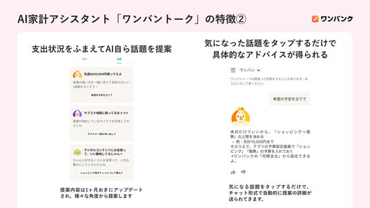 AI家計アシスタント『ワンバントーク』は、「記録・集計ツール」だった従来の家計簿アプリとは違い、AIを活用し「家計改善のアドバイスから行動の代行までを担うエージェント」として利用者に伴走する機能です。