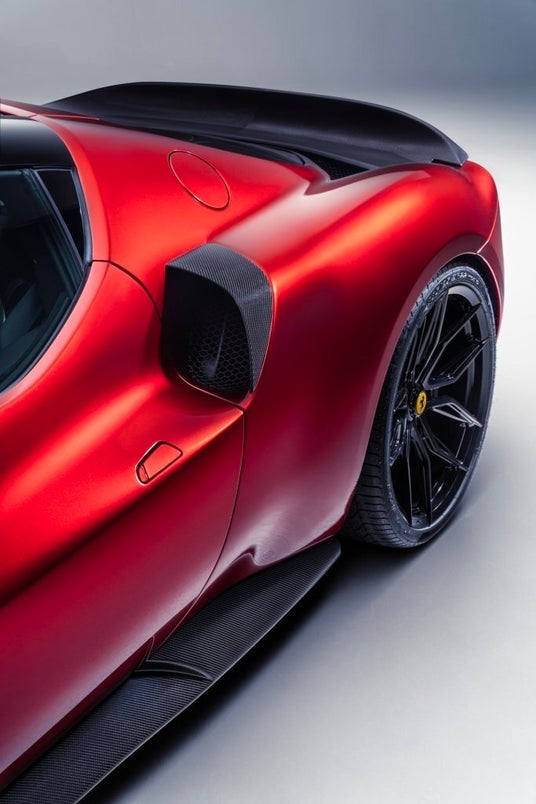 NOVITECでは、フェラーリ296GTBにさらにアグレッシブな印象を与え、ダウンフォースを増大させるために、複数のカーボンエアロダイナミクスを開発。そのパーツの一つ一つはネイキッドカーボンに、高光沢のクリアコートにて仕上げられております。NOVITECのコンポーネントで仕上げられたフェラーリ296は、本格的なレーシングルックであり、風洞実験にてクリアした利点も兼ね備えております。 オリジナルバンパーの中央エアインテーク用のNOVITECフロントリップスポイラーと、ダックテールリアスポイラーは、最適な空力を実現するように設計。またリアエンドは、リアスポイラーやディフューザーにてエクステリアをより強化することも可能です。また迫力のあるスタイルのNOVITECロッカーパネルはフロントからリアの間で最適な空力を実現するように設計されております。ドアミラーとクォーターガラスに位置するカーボンは、エンジンのエアインテークカーボンスクープとともに、スポーティーな印象を与えます。