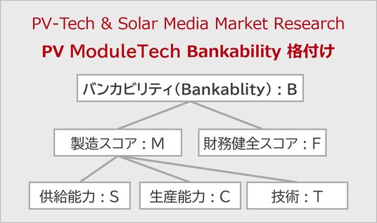 この格付けは、Solar Media社(2024年よりインフォーマ社の傘下)のPV Tech分析チームが、5年間の研究成果として開発し、2019年10月に誕生した、太陽電池モジュール(太陽光発電パネル)メーカーの総合的なバンカビリティ(Bankability)を判定する手法です。バンカビリティは、「製造スコア」と「財務健全スコア」の2つで構成されており、製造スコアはさらに「供給能力」「生産能力」「技術」の3つのスコアで成り立っています。この評価は、実際の太陽光発電所プロジェクトの実績情報に基づいて意思決定を行おうとする投資家や利害関係者が、重要視していると考えられています。